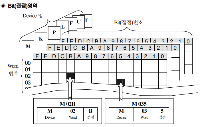 Bit 영역 Device라도 Word 단위 명령을 사용하면 16bit 묶음으로 해석되어 수치 데이터로 사용할 수 있다.