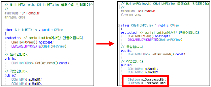 - HelloMFCView.h 파일 수정 : CButton 객체 생성